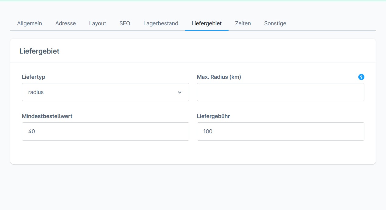 Es kann je Standort ein Liefergebiet definiert werden. Dieses beinhaltet den Lieferradius, den Mindestbestellwert und die jeweilige Liefergebühr
