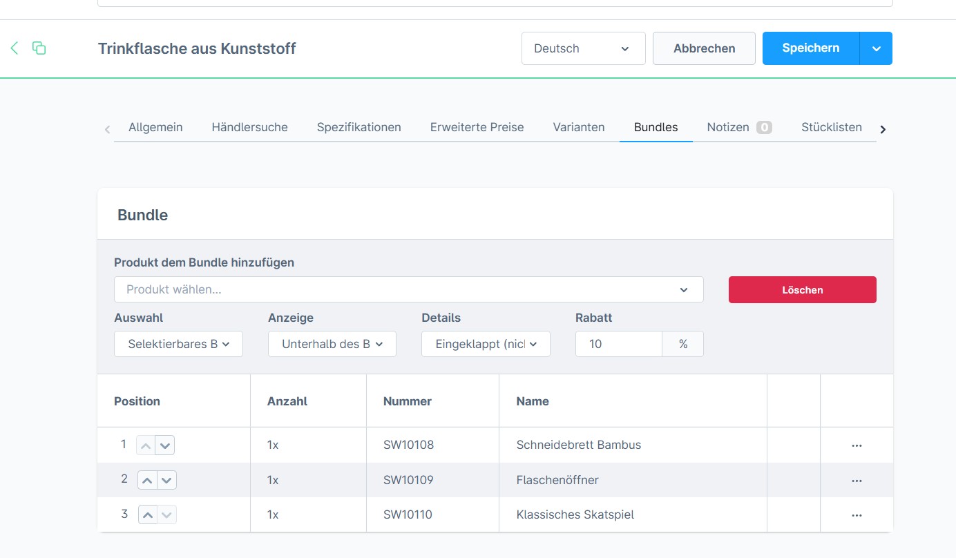 Du kannst ganz einfach ein Bundle im Produkt definieren, indem du im Bereich Bundle die Produkte einfügst, die du als Bundle anbieten möchtest. Es gibt einige Einstellungsmöglichkeiten, wie z. B. ob es unter der Produktgalerie oder auch im Warenkorb angezeigt werden soll.